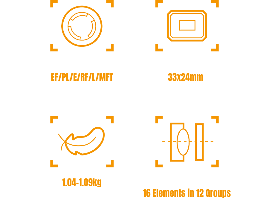 Great Joy 50mm T2.9 1.8x provides 6 mount options for different camera models: EF, PL, E, RF, L, and MFT mounts. Other mirrorless cameras can also use GREAT JOY T2.9 1.8x Anamorphic Lens with EF or PL mount adapter.