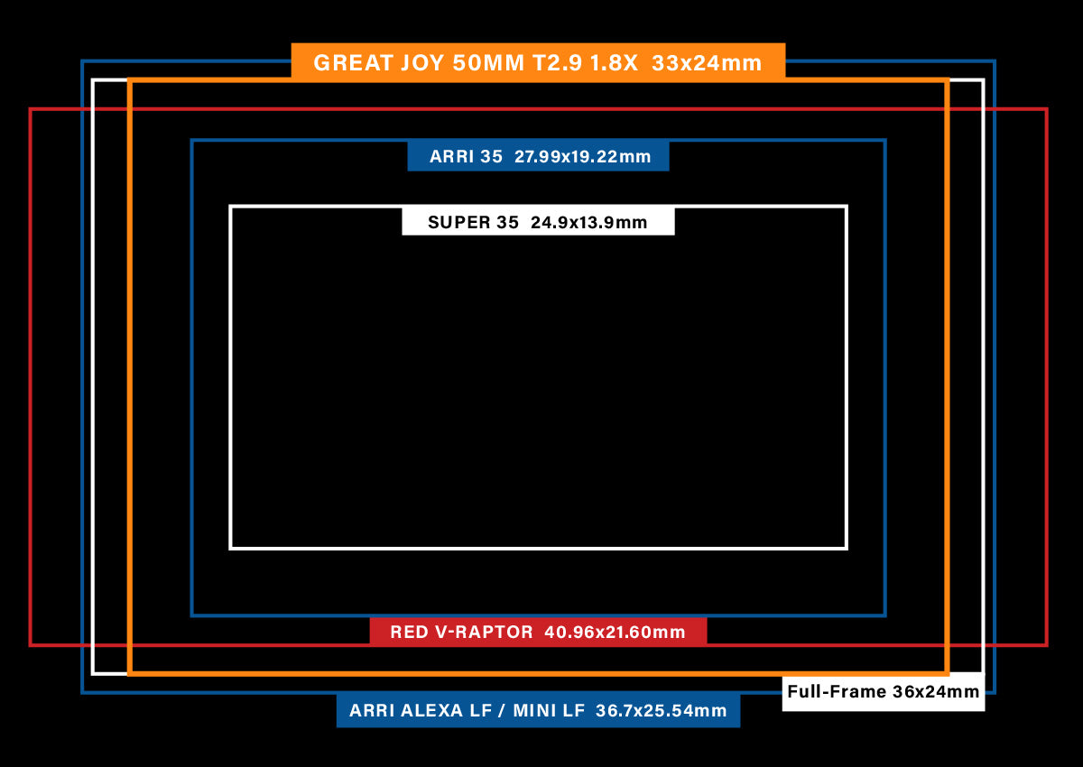 With 33x24 mm image circle, GREAT JOY 50mm T2.9 1.8x Anamorphic Lens supports full frame shooting with side cropping. If shooting in 4:3 full frame, you can get 2.4:1 image without any vignette.