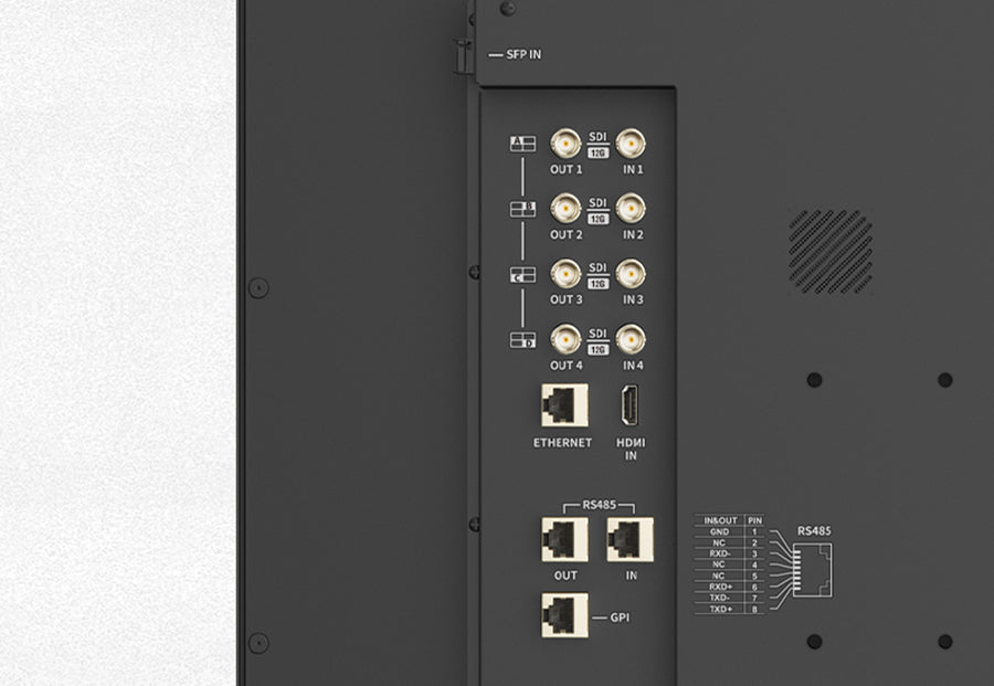 12GSDI 4-in 4-out, supports: Single link 4K; Quad link 4K and Quad link 8K HDMI 2.0 (4K60P) 12GSDI via SFP Fiber (Optional) ST2110 IP via SFP Fiber (Optional)
