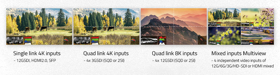 Supports Single link 4K input including 12GSDI, HDMI2.0 or 12GSDI via SFP, and Quad link 4x 3GSDI 4K or Quad link 4x 12GSDI 8K inputs. You can also input 4x independent 4K videos to multiview, supports 12G/6G/3G/HD-SDI and HDMI 2.0/1.4/1.3 mixed formats input, and waveform, vector, audio meters, EOTF, color gamut selection for each input.