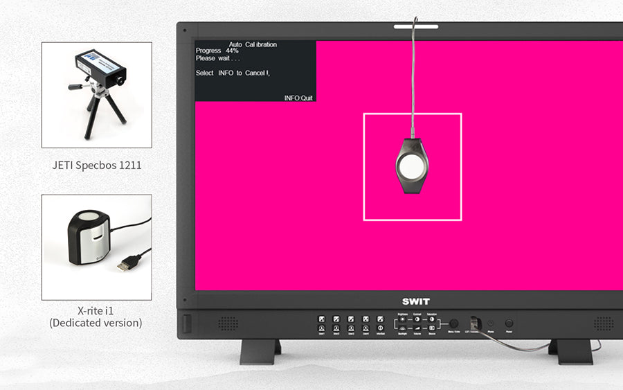 With built-in 3DLUT calibration software, (software copyright) support X-rite i1 and Jeti Specbos 1211 probes to directly connect with the monitor USB port. The monitor generates color patterns and the color probes read the color, send color info to monitor via USB. Then the monitor compares the color difference and generate 3DLUT and calibrate itself automatically. Calibration time: X-rite i1 15min, Specbos 1211 45min Calibration result: ∆E≤1.0