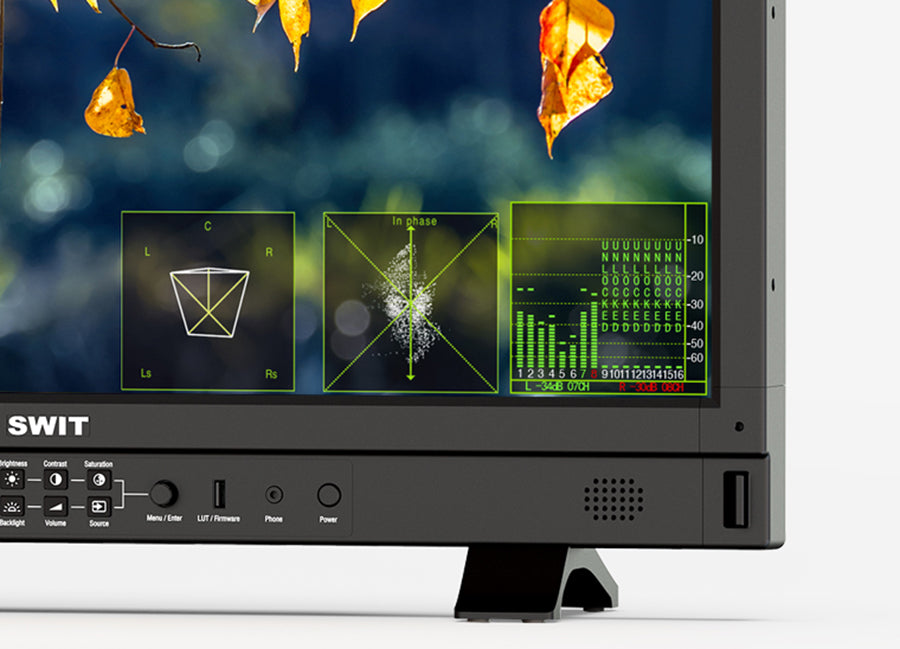 Max 16-ch embedded audio meters display, and select any 2 channels audio to output via speaker or 3.5mm headphone socket. Moreover, BM-U monitors support Lissajous and 5.1+2 surround sound patterns.