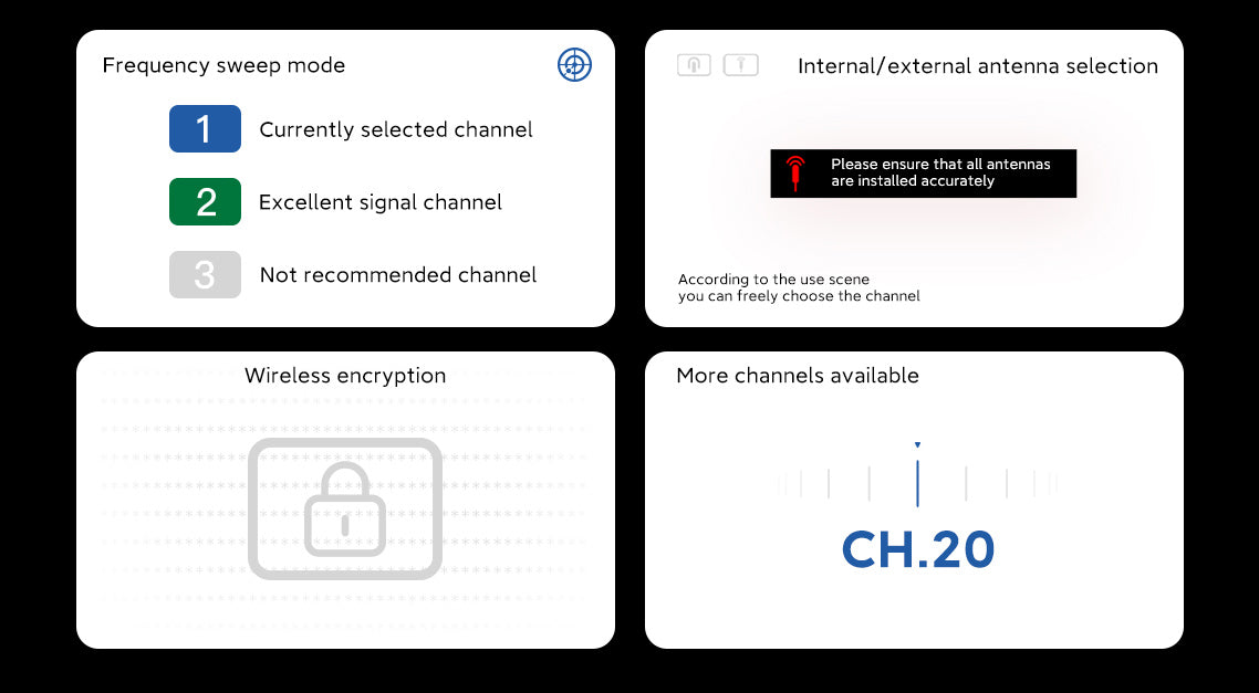 Have all the functions of traditional wireless video system, and optimized the interaction method. Provides different antenna selection methods and integrates frequency sweep function.