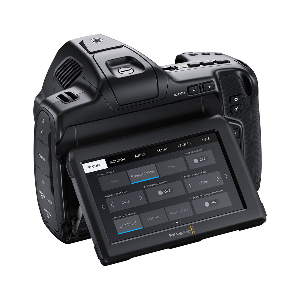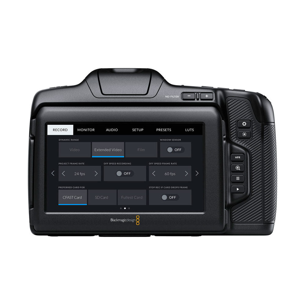 To top their previous achievement with the Pocket Cinema Camera 6K, Blackmagic Design adds an even more full-featured, compact Super35 camera to their cine-style line with the Pocket Cinema Camera 6K Pro. The 6K Pro features all the recording features, sensor, dynamic range, buttons, and ports as its predecessor, and adds a variety of important new features such as a 5" tilting HDR capacitive touchscreen LCD with 1500 cd/m² brightness, a Pro EVF option, built-in clear/2/4/6-stop ND filters, dual mini-XLR inputs, an accurate timecode clock, an NP-F570 L-series battery slot, and updated Gen 5 color science.