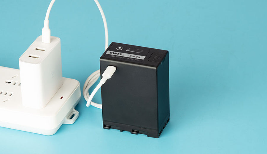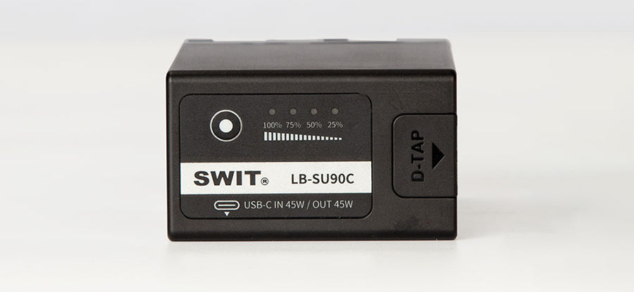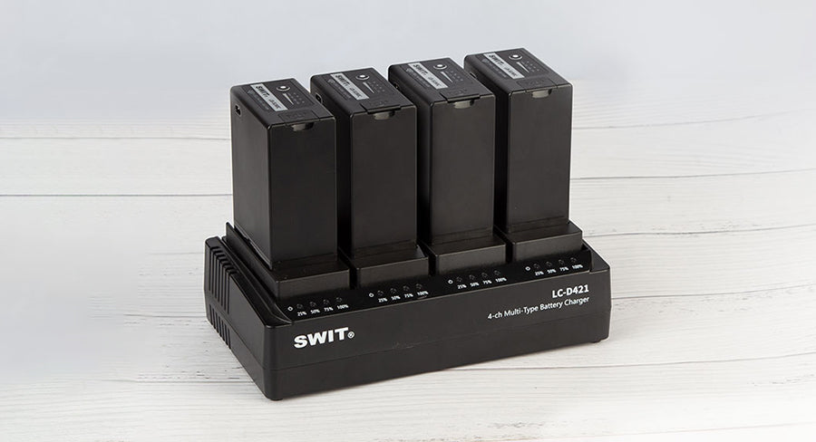 LB-SU90C can be charged by SWIT S-3602U 2-way charger, SWIT PC-U130B2 D-tap charger, or LC-D421 4-way charger. By the LC-D421, You can charge 4 batteries simultaneously, and fully charging within 3.5 hours.