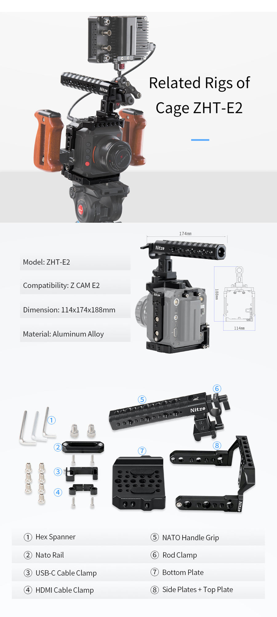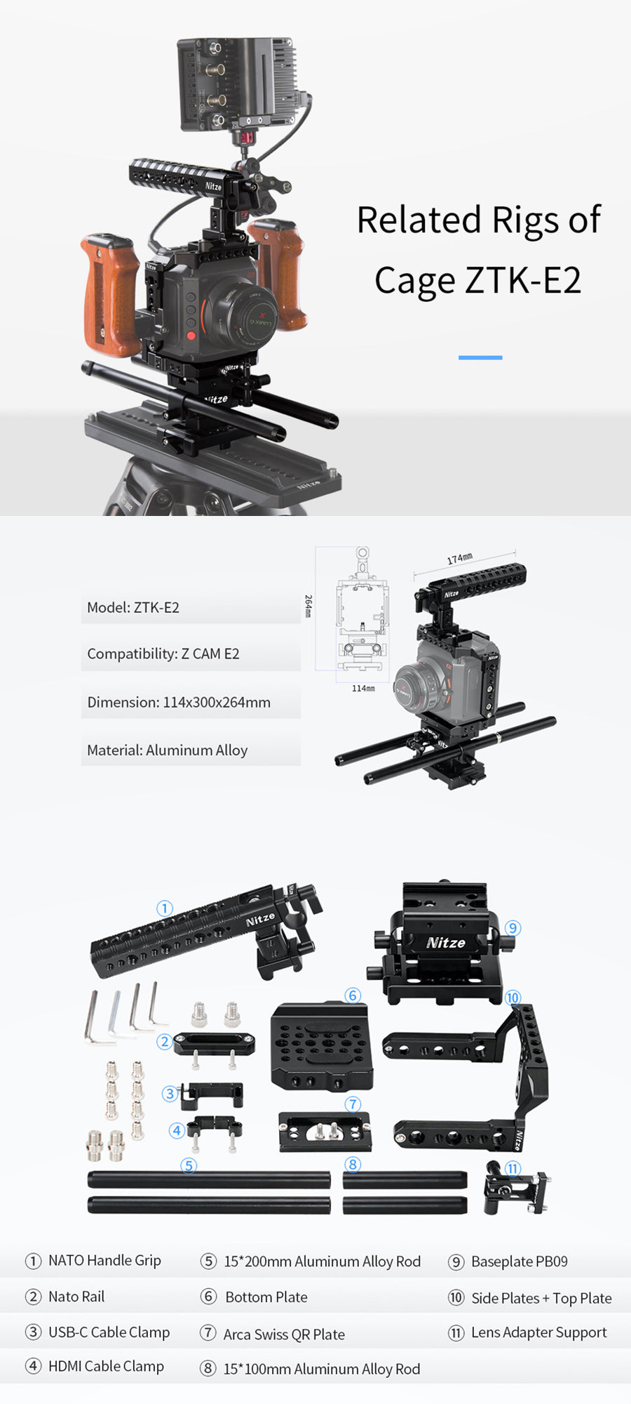- Nitze ZHT-E2 Z CAM E2 camera cage kit adopted modular and lightweight design. You can use the side panels or the bottom panel separately according to your operation needs.