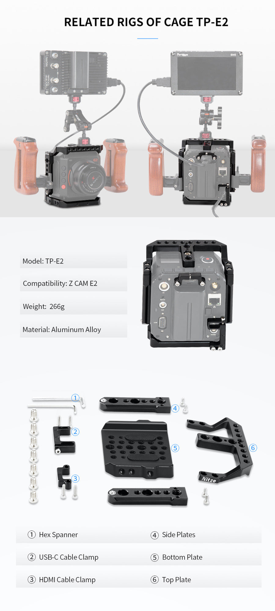 - Nitze TP-E2 Z CAM E2 camera cage adopted modular and lightweight design. You can use the side panels or the bottom panel separately according to your operation needs.