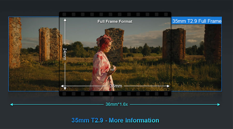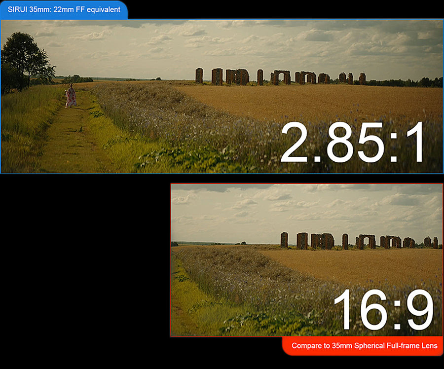 The 35mm anamorphic is equivalent to the horizontal field of view of a FF 22mm, allowing more elements to be included into the frame, therefore suitable for shooting architectures, landscapes, and tight spaces.