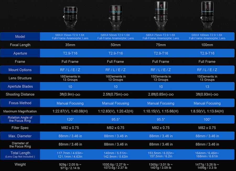 SIRUI 1.6x Full-Frame Anamorphic Lineup