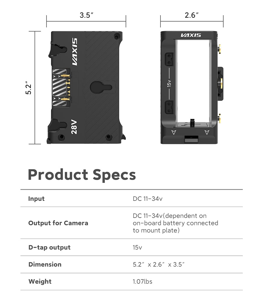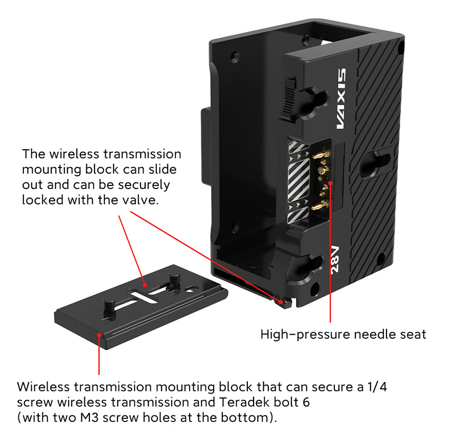 The quick-release plate with sliding functionality enhances the interoperability of the Vaxis Dual Voltage Wireless TX Cradle.