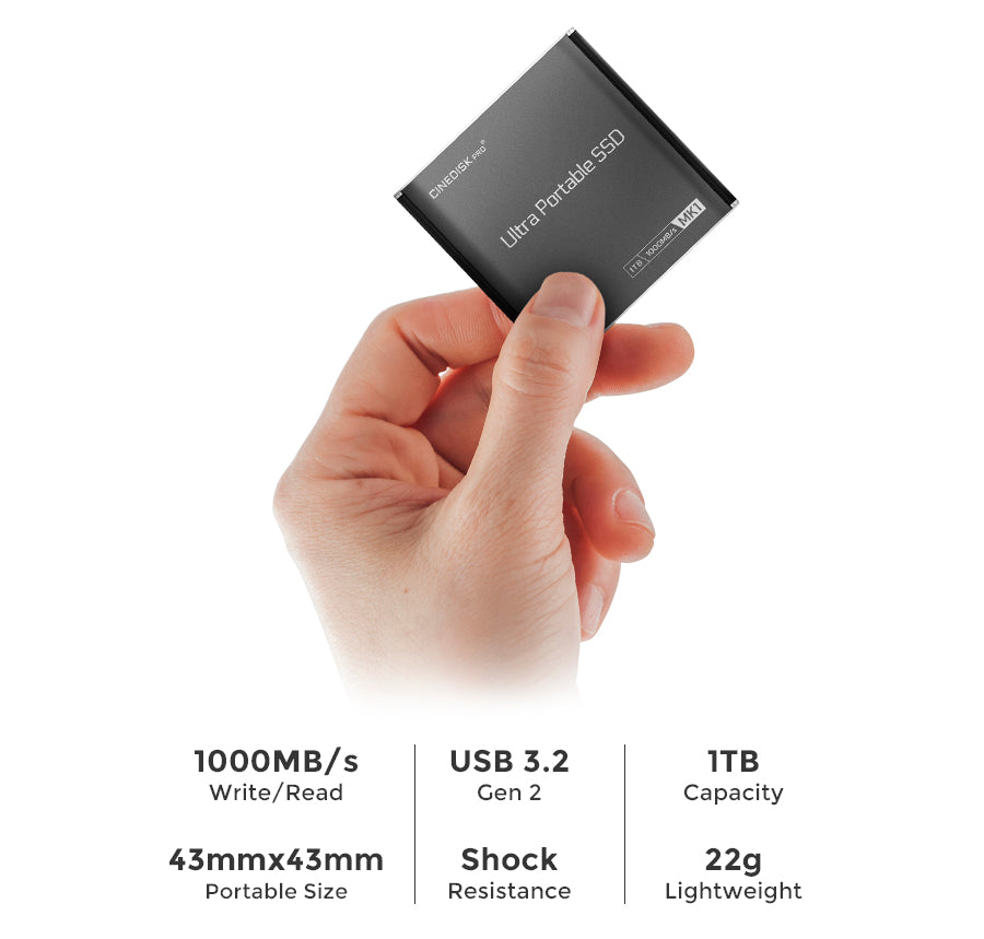 The Ultra Portable SSD MK1 delivers fast speeds with easy and reliable data storage for transfering large files. Whether you’re storing critical Raw Video Footage, Photo business documents, games, or movies, the Ultra Portable SSD MK1 gives you speed and durability in a palm-sized package.