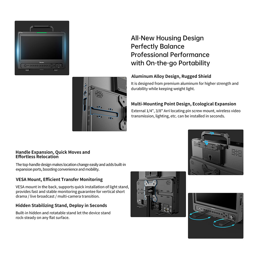 VESA mount in the back, supports quick installation of light stand.provides fast and stable monitoring guarantee for vertical short drama / live broadcast / multi-camera transition.