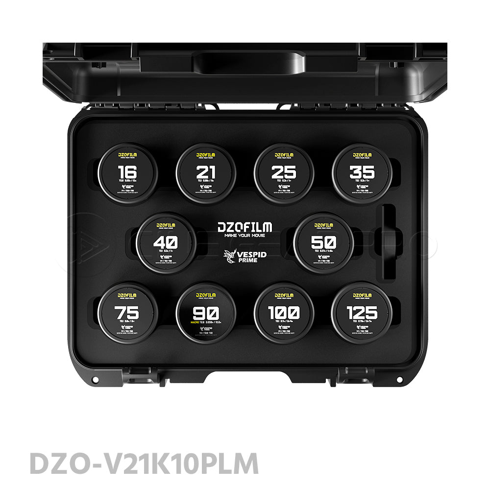 This DZOFilm VESPID Prime Cine 10-Lens Kit is suitable for use on productions ranging from independent to studio films. The included 21, 25, 35, 40, 50, 75, 100, and 125mm T2.1, 16mm T2.8, and Macro 90mm T2.8 PL mount lenses cover full-frame sensors and project a 46.5mm image circle yet are small and lightweight, making them an excellent choice for handheld, gimbal, and drone work.