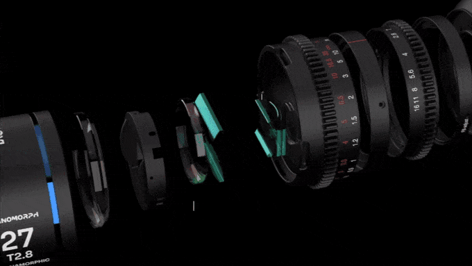 The anamorphic blocks are put behind the spherical elements and the focusing groups. These two groups compress the image, and hence the smaller anamorphic blocks can be used, which makes the lens tinier. Moreover, the image is formed and focused before the anamorphic blocks which maintains a constant squeeze ratio no matter if the focus changes.