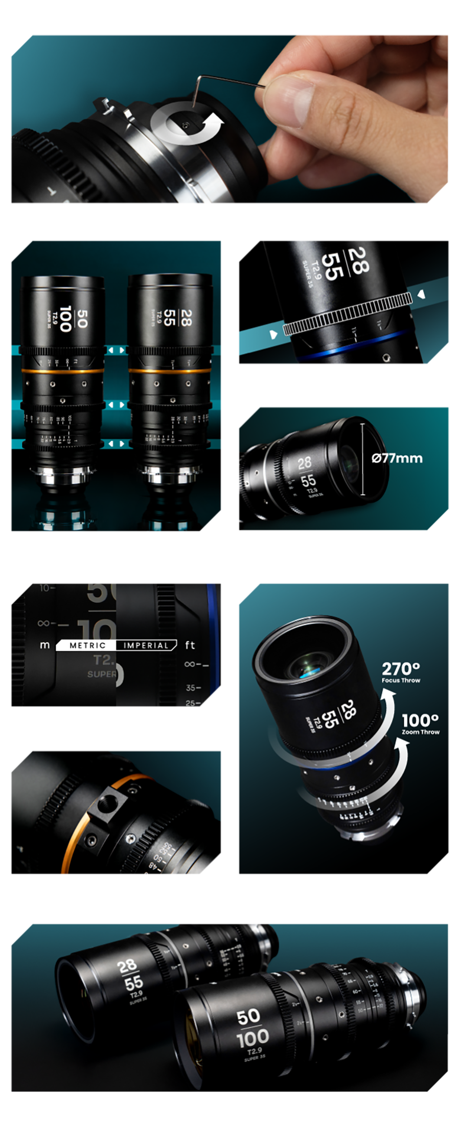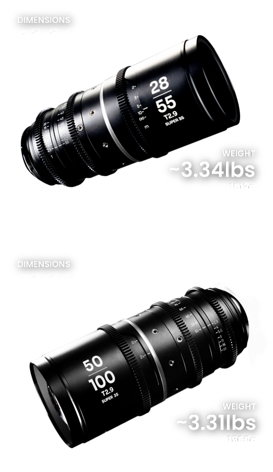 The 28-55mm and 50-100mm lenses together provide a versatile zoom range of 3.6x, making them perfect for mounting on cars, gimbals, or steadicams to capture footage. One common frustration is constantly changing focal lengths between shots. However, with these zoom lenses covering a range from 28mm to 100mm, you can capture different perspectives and significantly reduce the time spent changing between lenses.