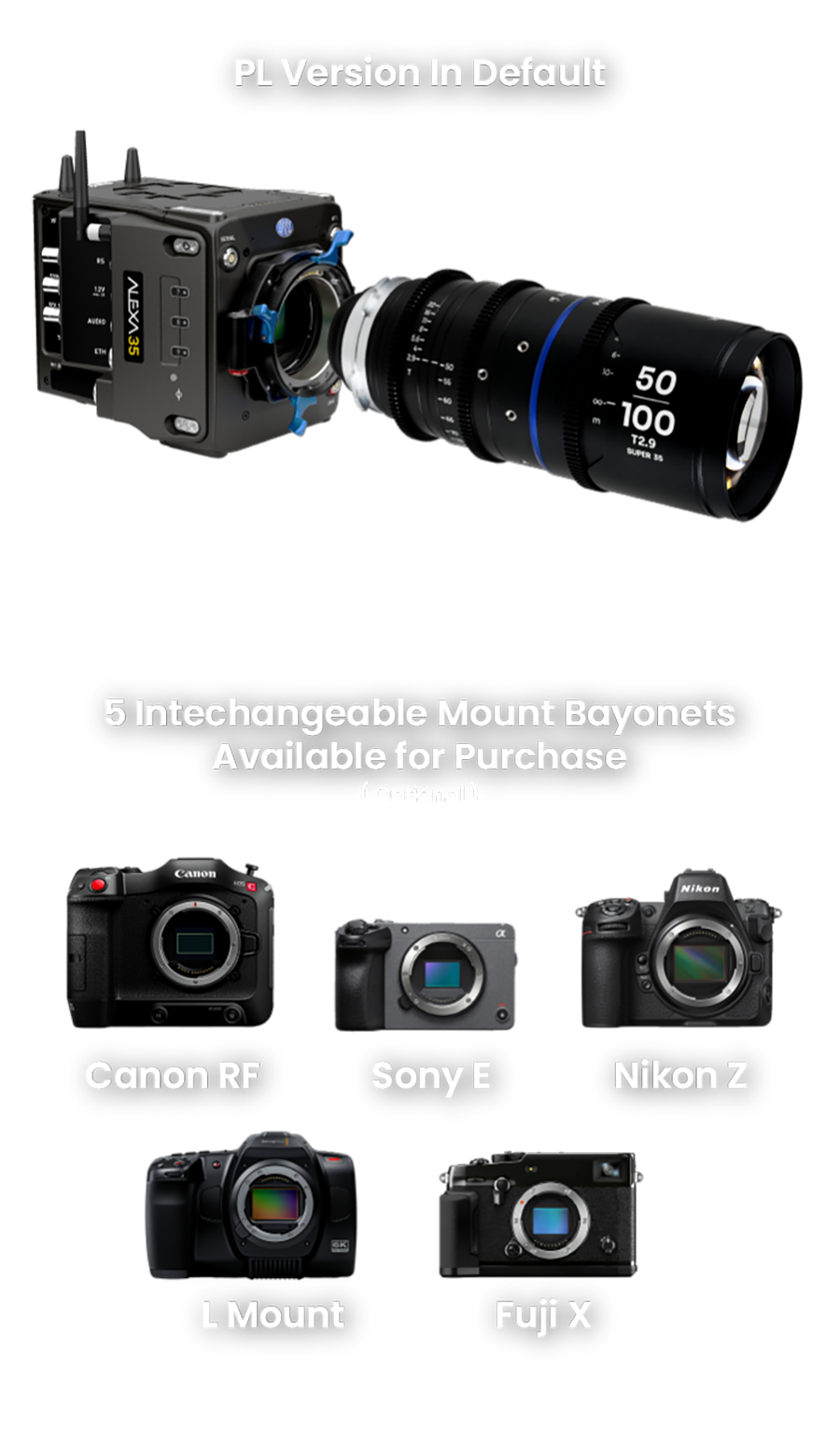 The Nanomorph Zoom* comes in a default ARRI PL version, ensuring compatibility with a wide range of professional cinema cameras. Optional mount bayonets for Sony E, Canon RF, Nikon Z, Fuji X, and L Mount are also available for purchase (50USD each, 100USD for a set), allowing users to seamlessly adapt the Nanomorph Zoom to their preferred mirrorless camera system.