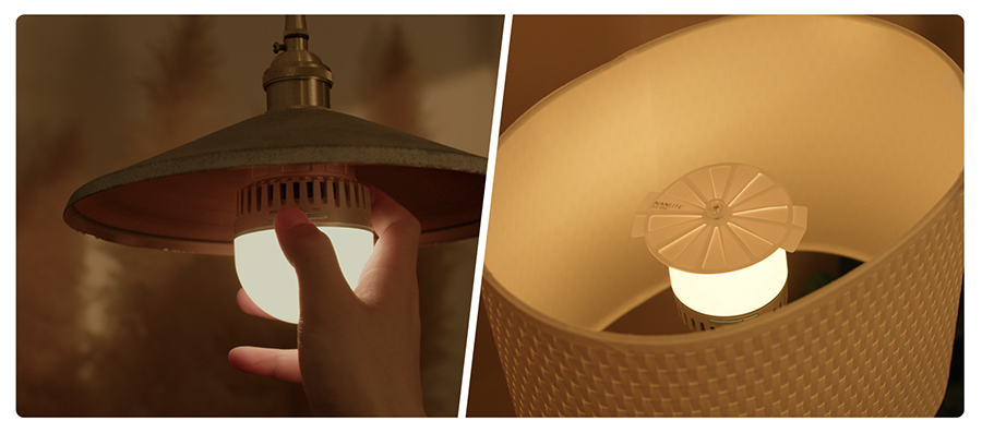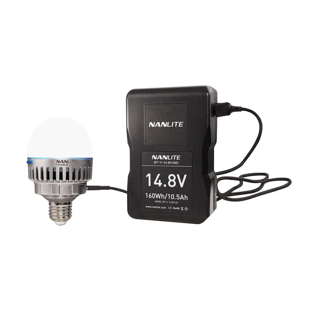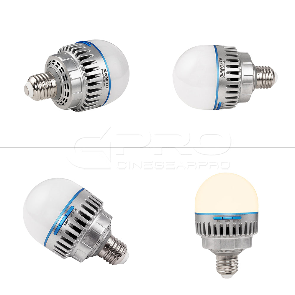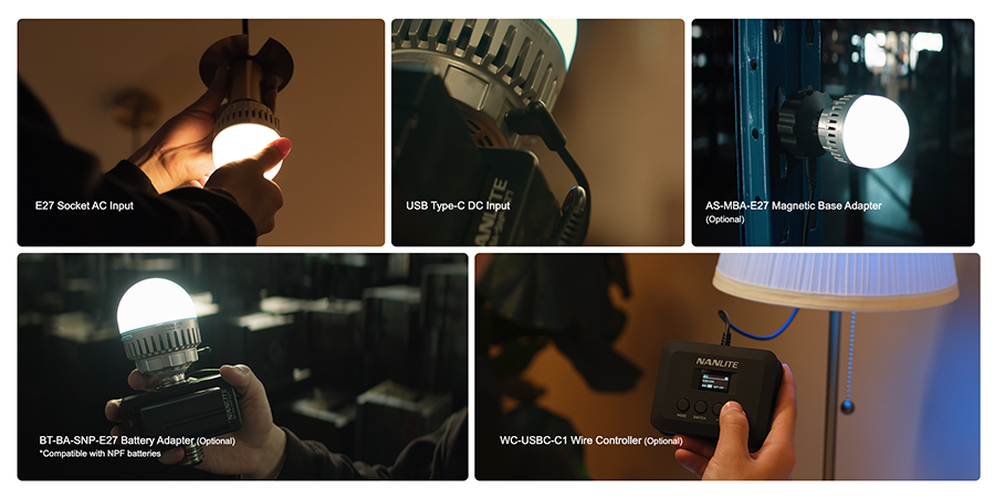 The PavoBulb 10C fits into a standard E27 socket and gets powered from the lamp's AC, but it also has external battery capabilities for locations without available AC. A range of optional accessories allows it to be used anywhere. The Nanlite E27 Magnetic Mount and AC Adapter is an optional accessory with a magnetic mount, providing more freedom for placing a PavoBulb in shots to appear as a normal lightbulb when used in the frame, providing scene-based lighting.