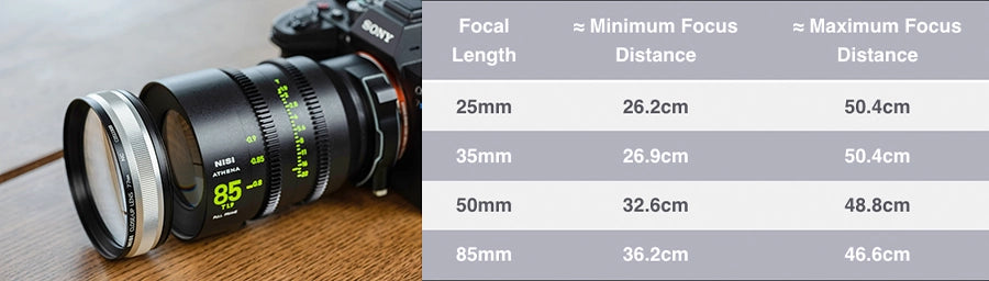The NiSi 77mm Close-Up lens is an excellent accessory for the NiSi ATHENA Cinema Lenses. When combined with the 25/35/50, and 85mm Athena lenses, it allows for a shorter focus distance. Here are the minimum and maximum focus distances when used together.