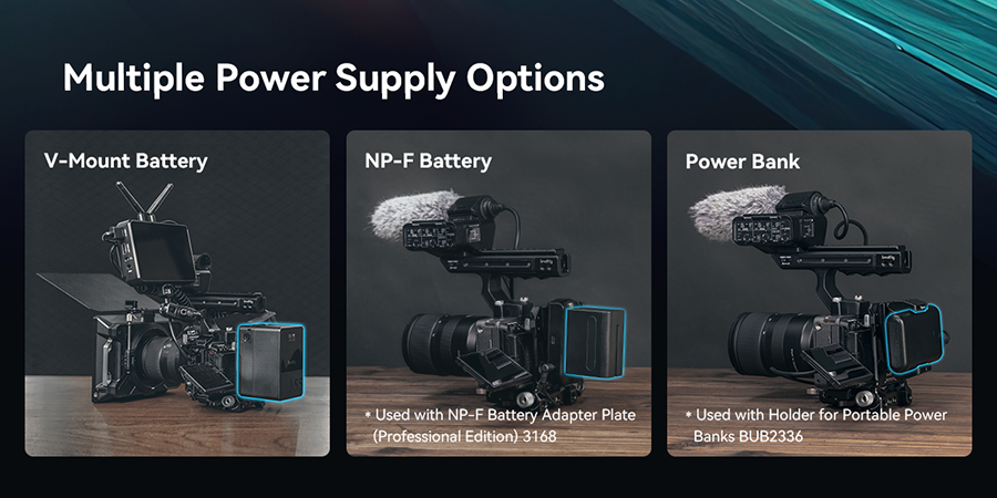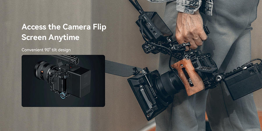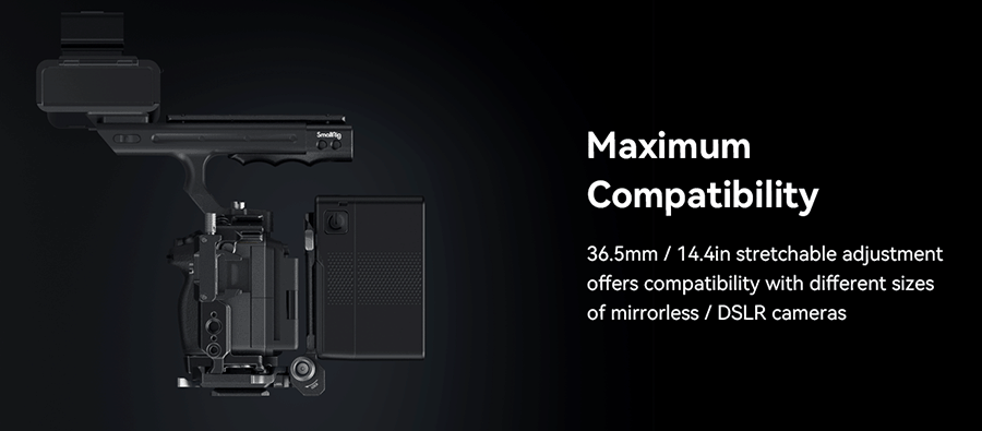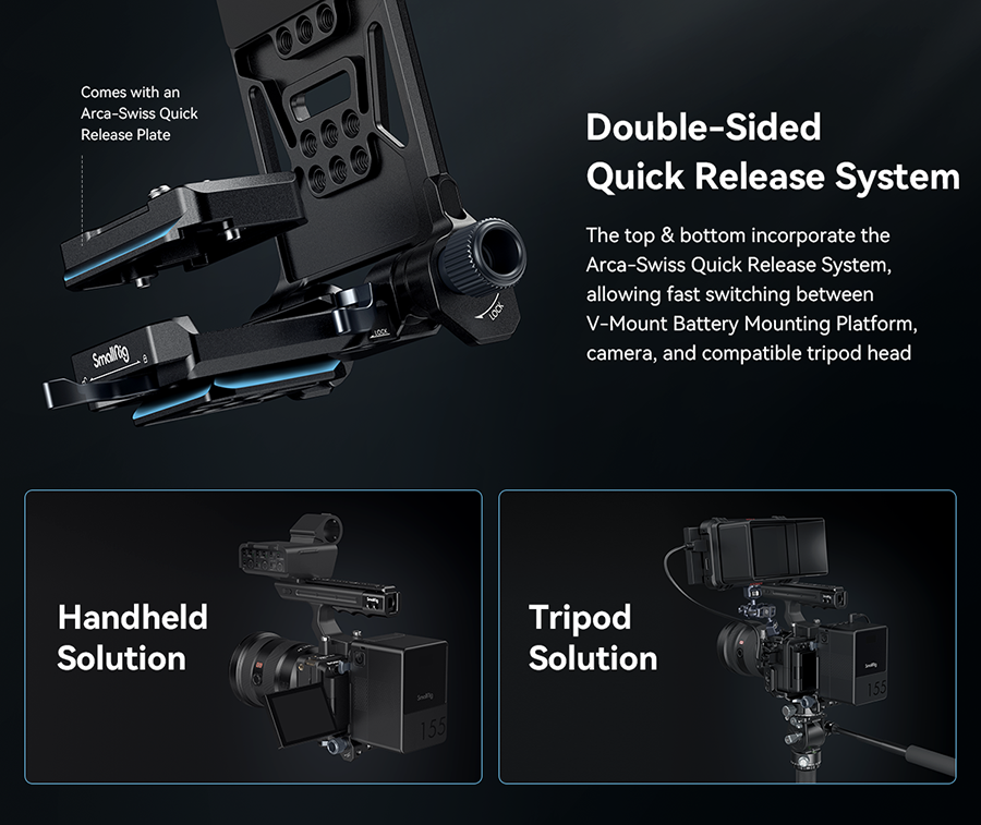 SmallRig Compact V-Mount Battery Mounting System 4064 represents a compact, lightweight, convenient, all-in-one mounting solution for V-mount battery. The kit consists of a V-mount battery plate, an Arca-type quick-release plate, and a V-mount plate. Particularly, the baseplate can be stretched to fit mirrorless / DSLR cameras of various sizes, which is helped by tool-less installation and adjustment, quick and time-saving. Beyond any cage with a built-in Arca-type plate, it can directly support the camera and DJI RS series gimbals via the Arca Swiss quick-release plate. The V-mount battery plate, featuring 1/4"-20 threaded holes and a V-mount plate, provides more power supply solutions by attaching NP-F Battery Adapter Plate Professional Edition 3168 or Holder for Portable Power Banks BUB2336. Switching between handheld shot and tripod shot is also easier, thanks to the bottom Arca-type plate. The 90-degree rotatable V-mount battery plate leaves enough room for flip screen, with pivot dampening preventing your device from falling. It can be folded down for increased compactness and portability.