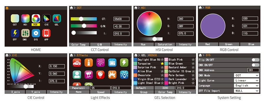 › CCT/HSI/RGB/CIE/GEL/EFF color modes