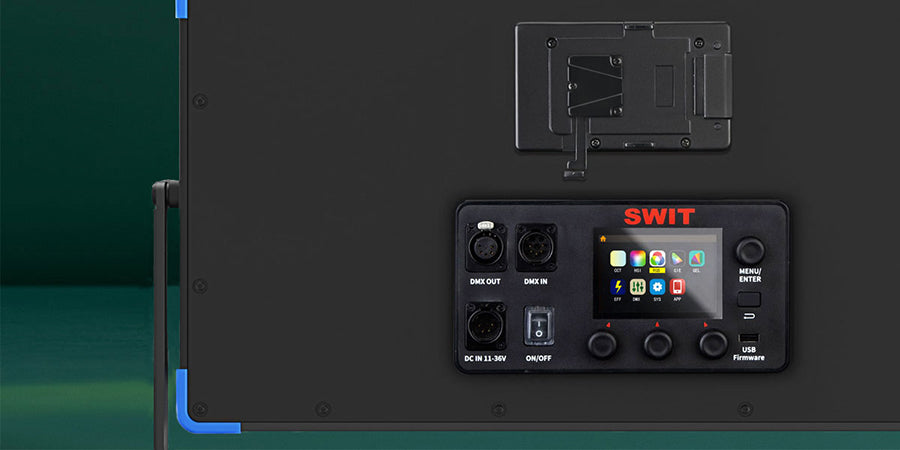 VANGO-100 rear control panel supports 5-pin DMX in & out, 4-pin XLR DC 11-36V in, and V-mount battery plate (Gold mount for option), and a large color LCD with menu and hot keys for convenient color picking. The USB-A port is for firmware update or user color profile upload, and to power wireless DMX receiver.