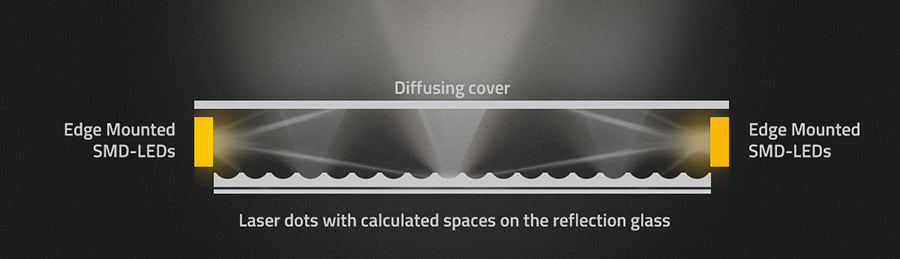 The traditional edge mounted LED lights are always not so bright, because half of the light will go to the backside, even if there’s reflection board, there’s still a lot of light lost. SWIT innovative technology is to add laser dots with calculated spaces on the reflection glass, so that the multi angles of edge light will be converged on the laser dots, and output 90° to the front with minimum light lost. Then the slim edge mounted light can also be high brightness.