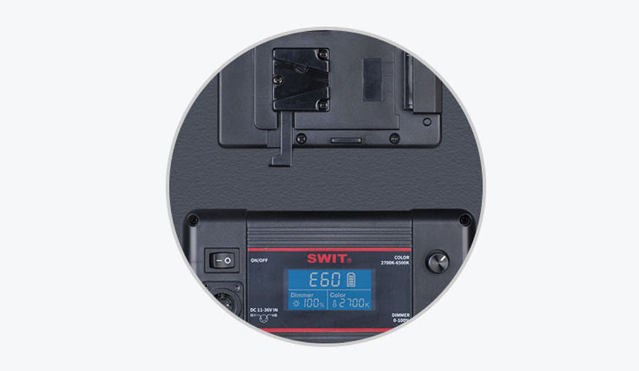 PL-E60 supports 11-36V wide range voltage input, with 4-pin XLR DC socket, and equipped with V-mount or Gold mount plate to power by batteries. (The default battery plate is V-mount.)