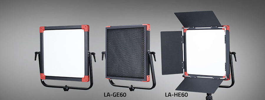 PL-E60 has all-metal housing, and provides the 4-leaf metal barn door and 40° metal honeycomb accessories, easy to assemble. Barn door (Model # LA-HE60) and Honeycomb (Model # LA-GE60) are optional purchased.