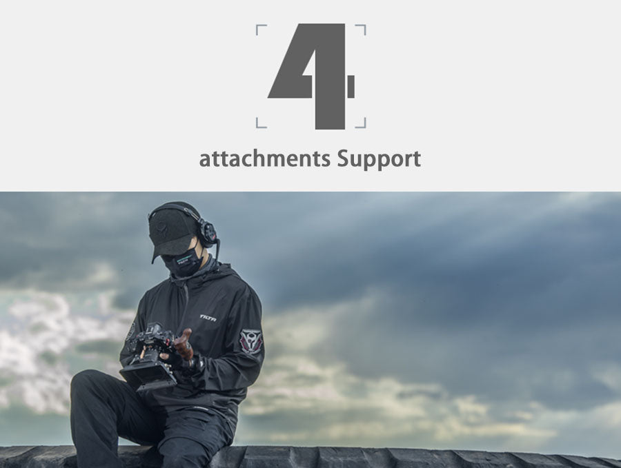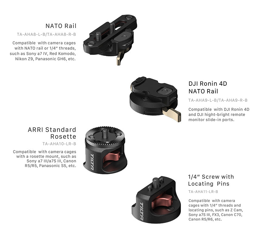 It can attach to your camera cage via optional Side Handle Attachments: Type VIII (NATO), Type X (ARRI Rosette) or Type XI (1/4″-20 with Locating Pins).