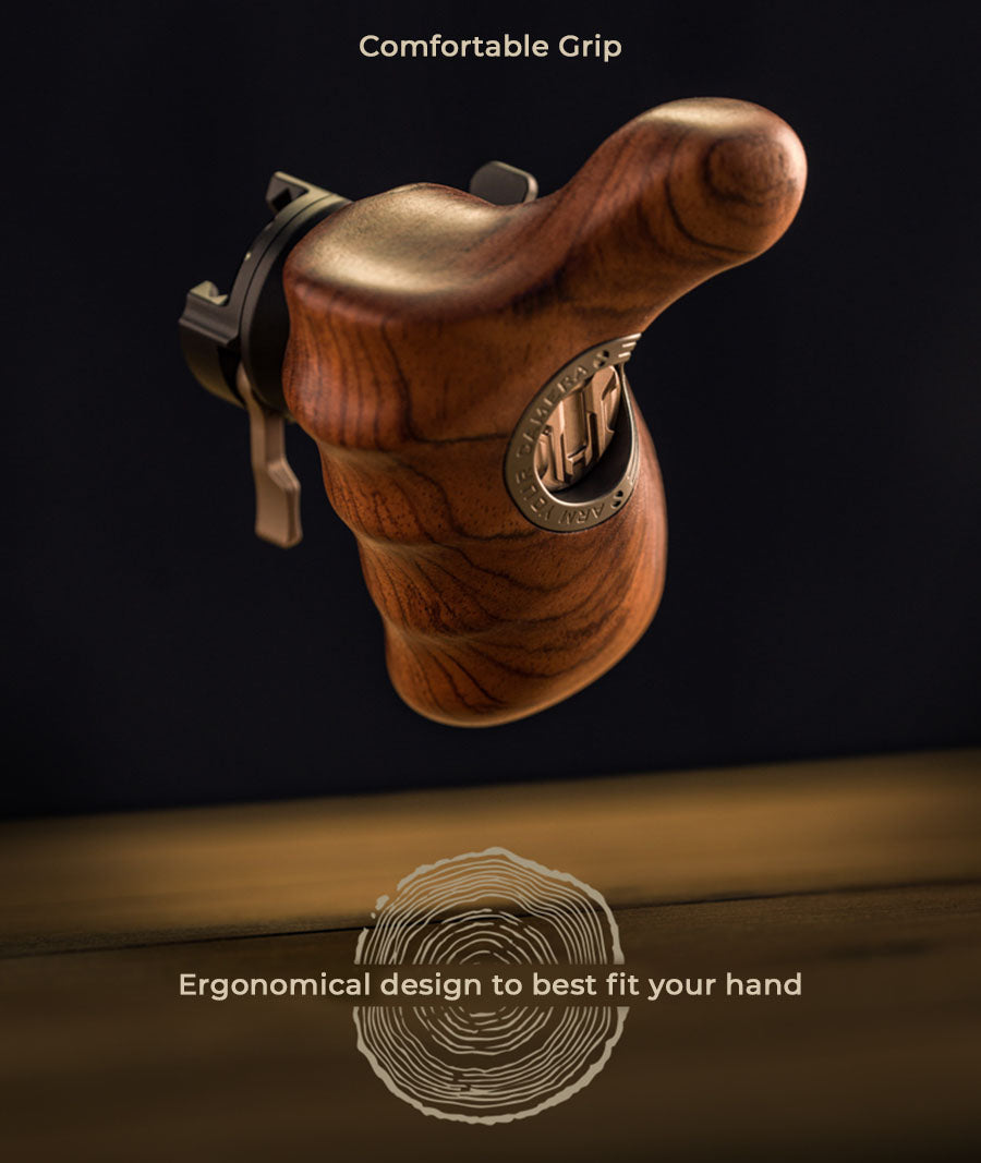 This Wooden Handle features an ergonomic design in order to provide maximum comfort when operating a camera of any size.