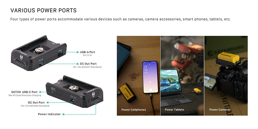 This allows you to power accessories via USB-C PD, as well as charge Sony L-Series Batteries while they are connected to the plate.