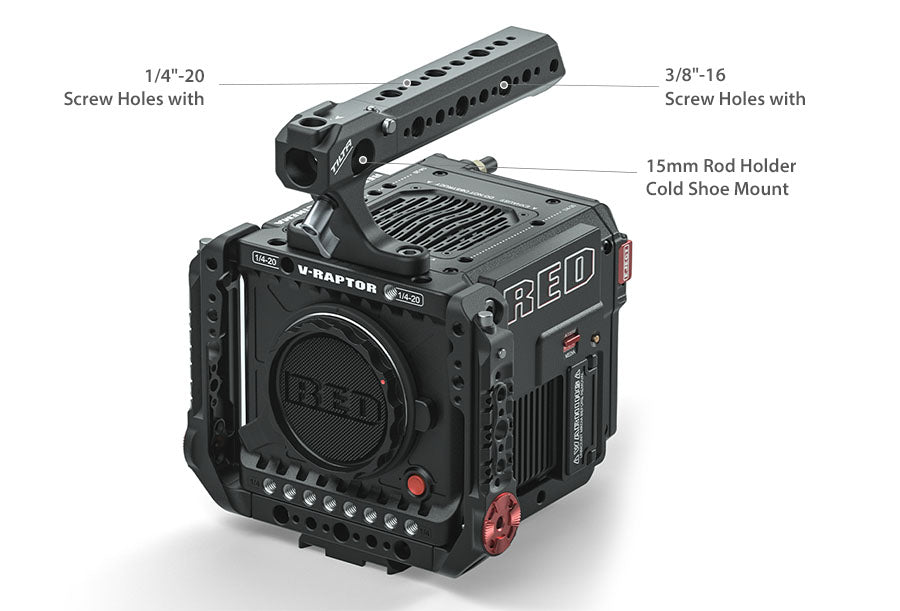 Matches the same height as the original Red camera top plate. Built-in cold shoe mount, 1/4"-20, and 3/8"-16 screw holes.