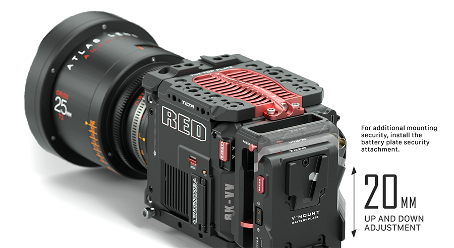 The original V-Raptor's V-lock cannot hold larger batteries securely. The Tilta V-mount battery plate can be adjusted up and down within a 20mm range to allow mounting larger-sized batteries than previously possible.