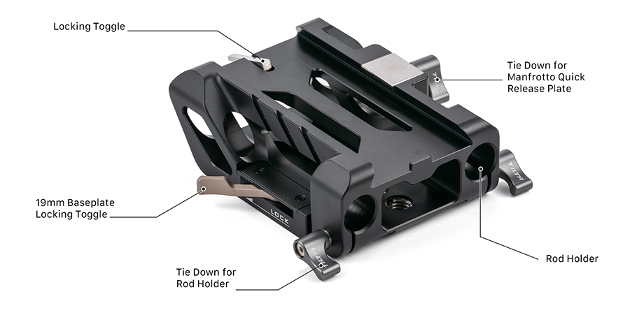 A lens adapter support can be installed to the front of the bottom plate. Multiple . built-in 1/4"-20 and 3/8"-16 screw holes on the bottom plate for mounting to a shoulder rig. Mount to a Manfrotto quick release plate to pair with the 15mm LWS baseplate.