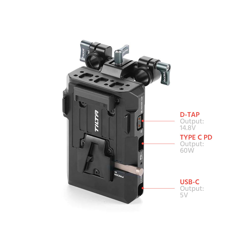 This Smart V-Mount Battery Plate features (2) 14.8V P-Tap Ports, (1) 5V USB-C Port, and (1) 60W USB-C PD Port which allows the battery plate to adjust the voltage needed for the accessory it is connected to.