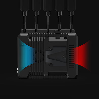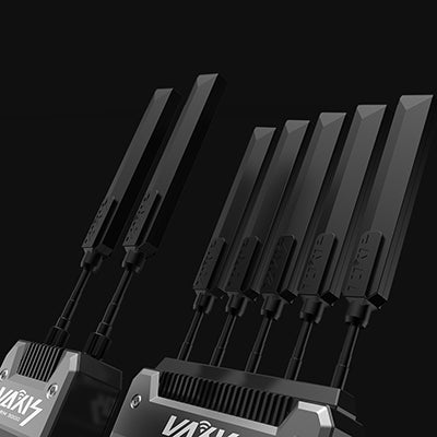 The wireless HD suite has 2 stick antennas in transmitter side, and 5 stick antennas in receiver side, and it can work in 5.1-5.9GHz frequency band and be flexibly software configured to licensed or ISM band of global different regions, as well as the side panel of both transmitter and receiver have been installed a control panel with OLED, which provides maximum 10 workable frequency channels, and supports maximum 10 sets working simultaneously.