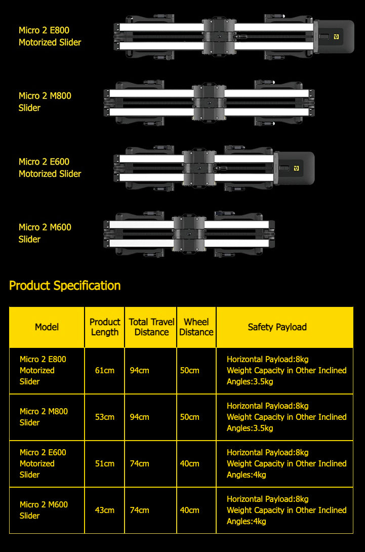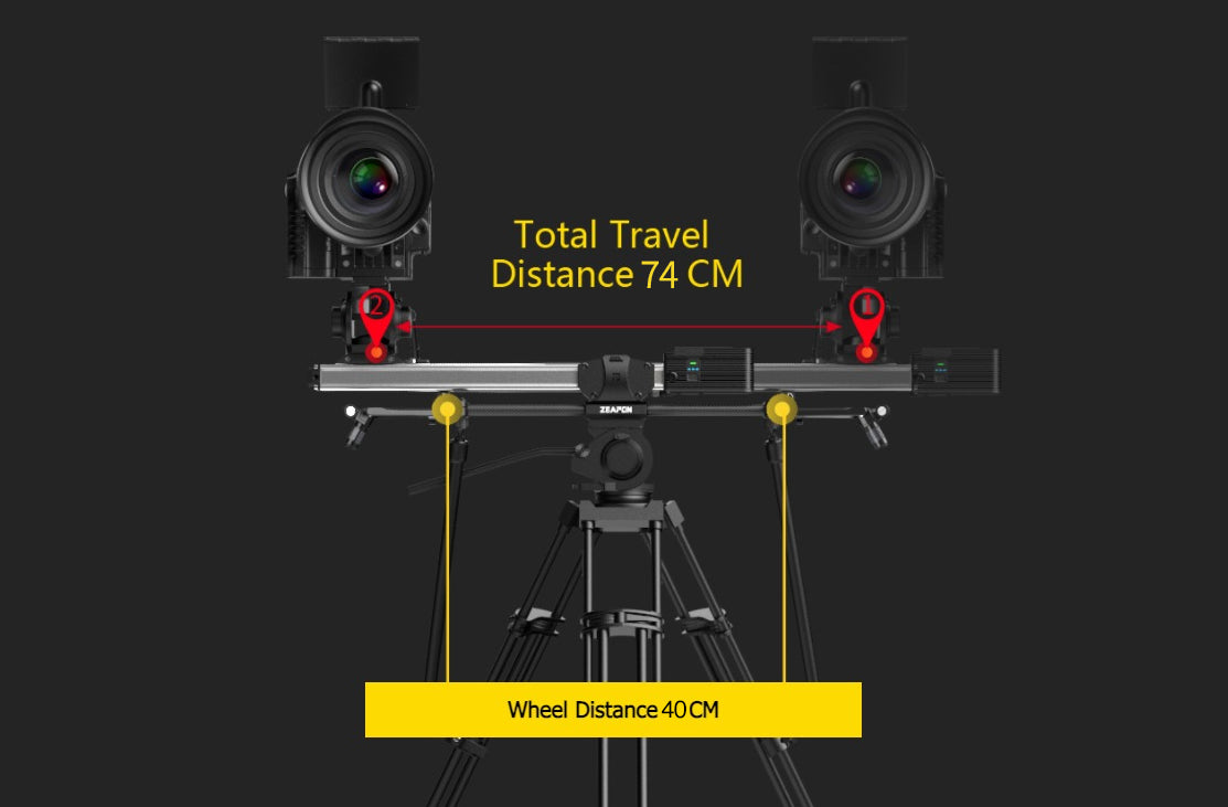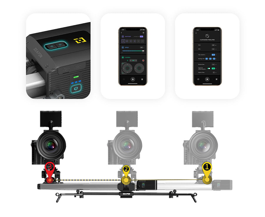 Micro 2 600/800 inherits the double-distance design while significantly shortens the slider length for greater portability and effectively avoids the slider getting in the way of your footage. You can not only use the direction buttons to manually position the slider, but can also use ZEAPON LAB app to intelligently set the waypoints and motion track for smooth cinematic footage.
